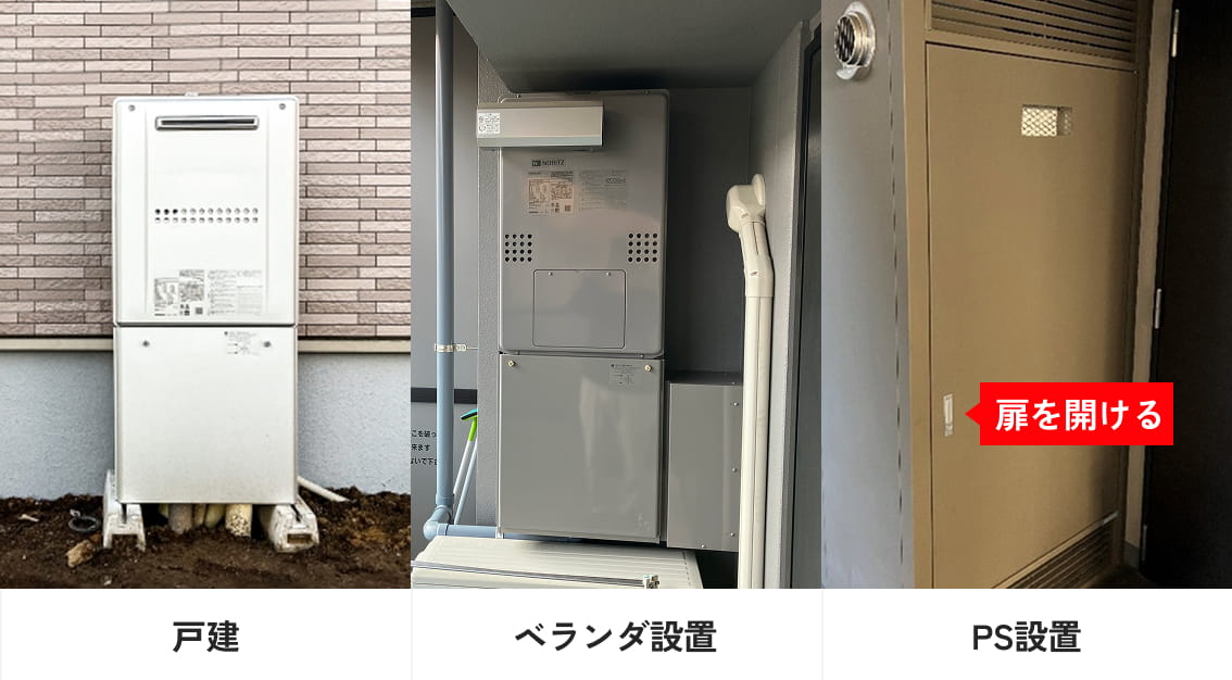 例:特殊なコンロ/排気筒のある給湯器/BF風呂釜など - 給湯器は壁掛型、据置型、PS設置型のみ写真で見積が可能です。排気筒のある給湯器・ガス瞬間湯沸器・室内型給湯器のお見積は現地調査が必要となります。