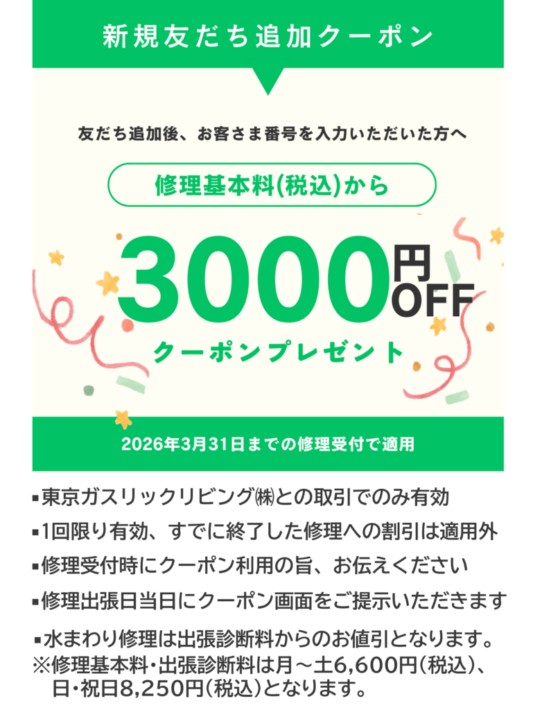 ※本クーポンは予告なく配布を終了する場合があります。すでにお友だち追加済みのお客さまに於かれましては対象外となります。弊社ホームページからではなくお友だち追加された場合も、対象外となる場合があります。予めご了承ください。