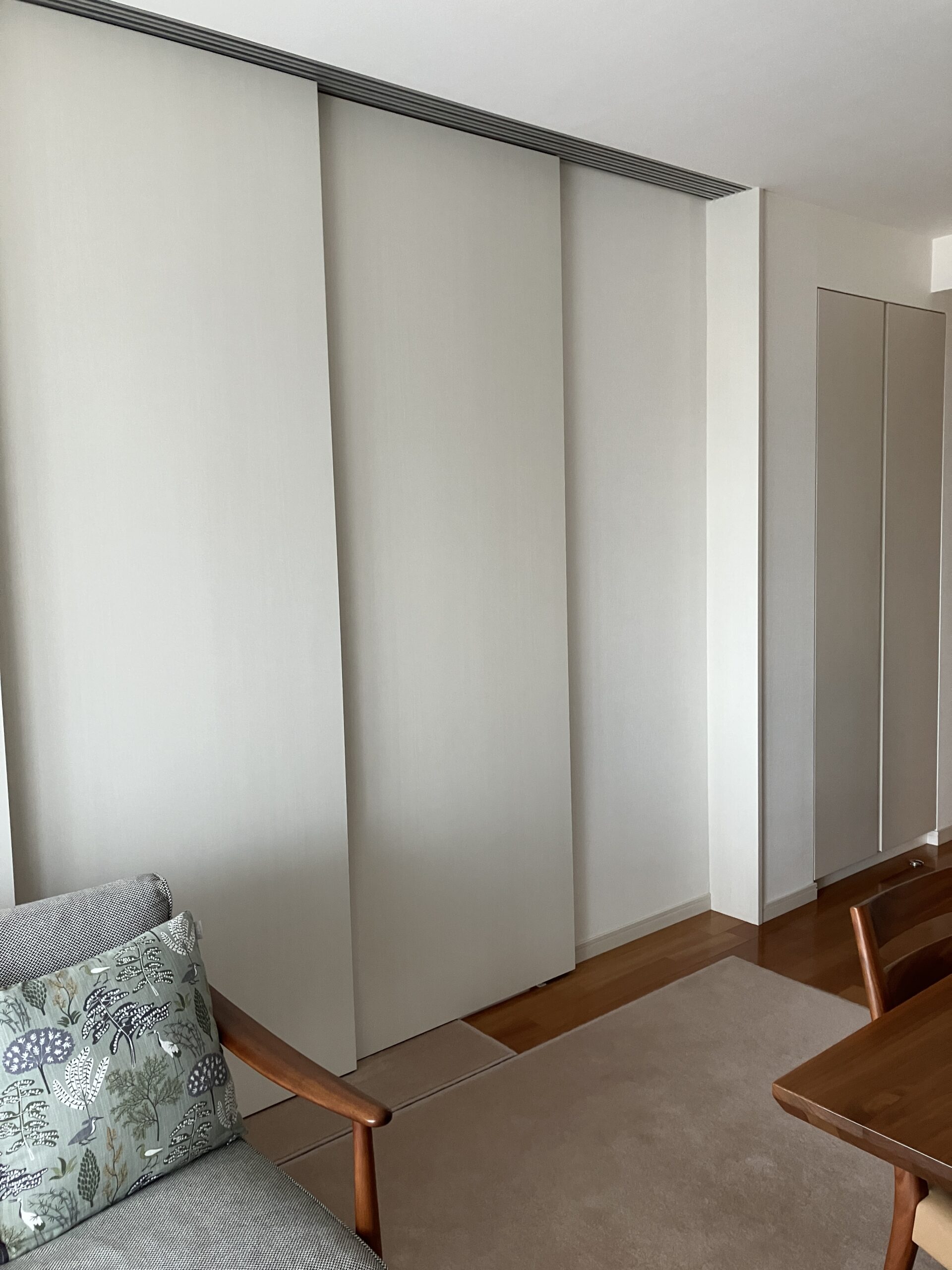 お客さまからは、部屋が明るくなり、間仕切りドアが軽くなって開け閉めしやすくなった。リビングの天井に木目のクロスを貼ってお部屋のイメージチェンジができた。とても満足しています。とのお声をいただきました。